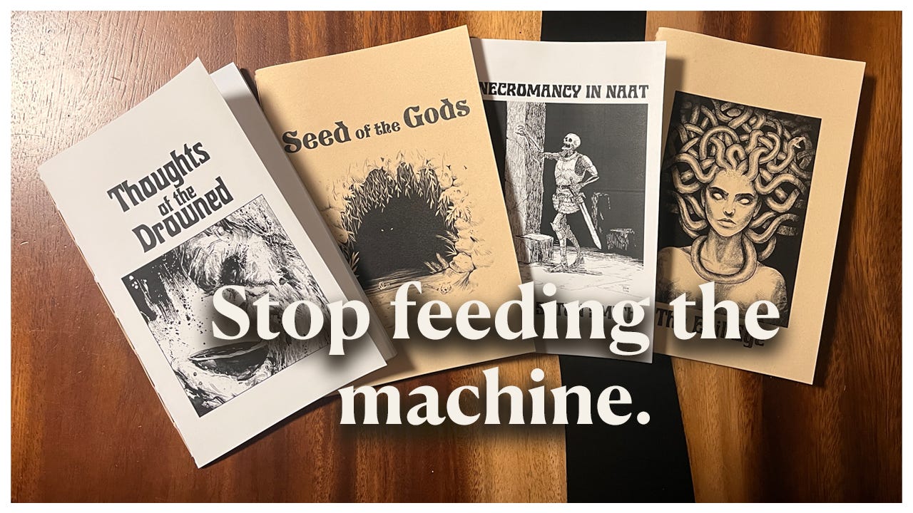 When a prospective reader picks up your zine, sees the linen thread in the spine, the crooked cuts on the margins, they’re forced to ponder it. To think about it. To handle it, to feel the grain of the paper touch their fingers, for the synapses to fire, connecting them to a memory of the last time they touched Hammermill printer paper and how much more boring that was… and how neat this new encounter is.